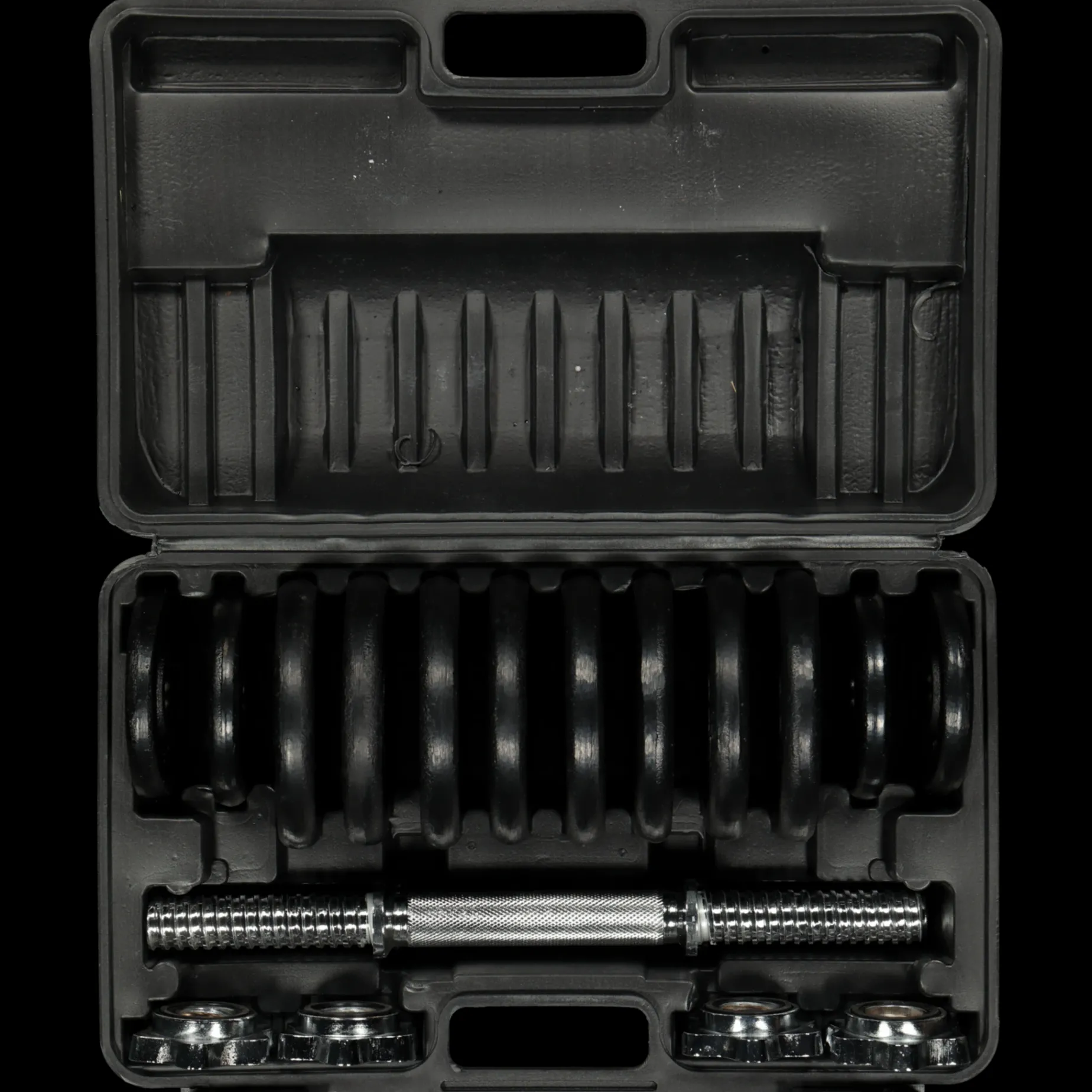 Koffert Med 10 Kg I Vektskiver Og To 35 Cm Lange Vektstenger Samt Lås. Sammenlagt Vekt Er 13,6 Kg. Perfekt Å Ha Hjemme. Vektskivene Er På 25 Mm.