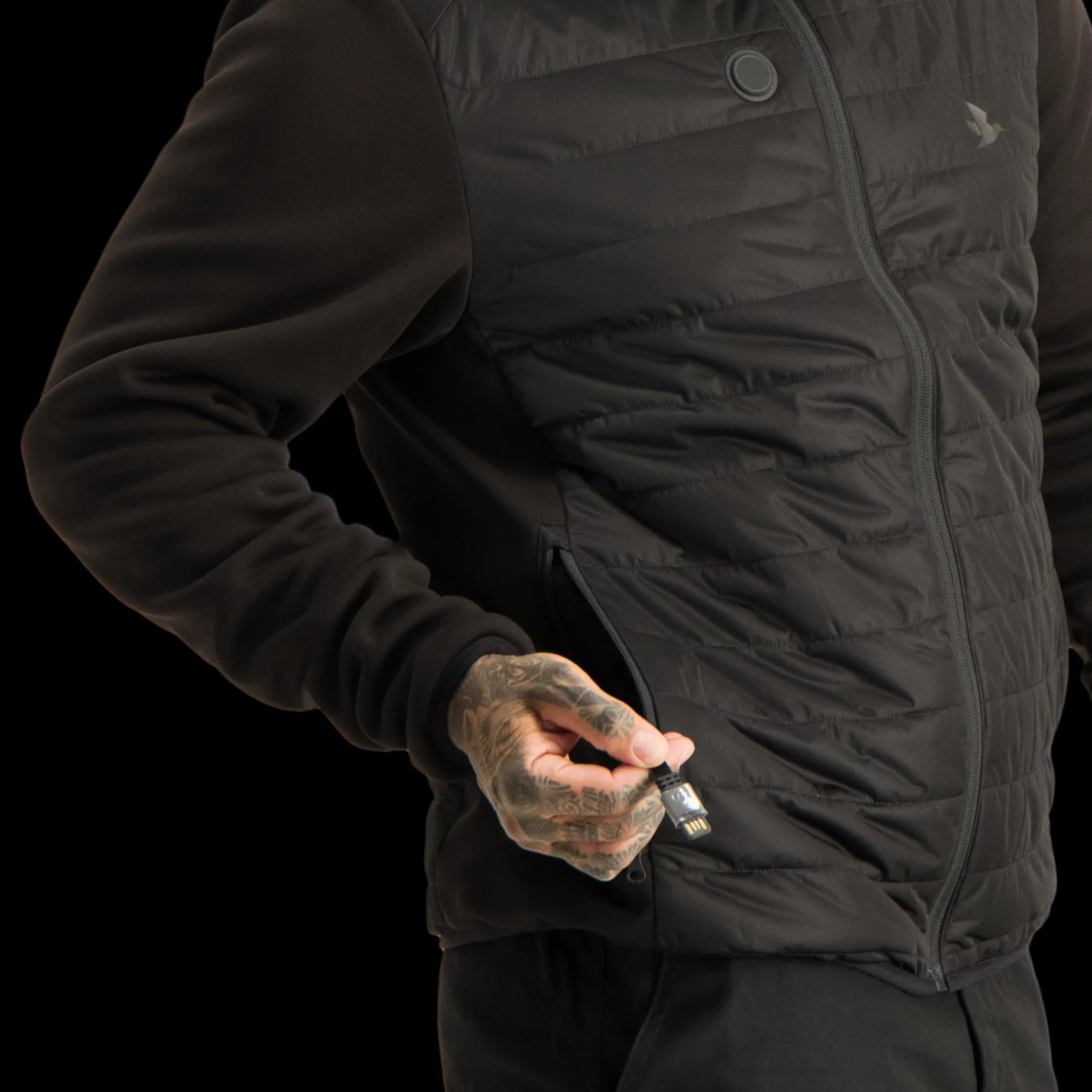 Varmejakke Med Stretchpaneler. Temperaturinnstilling Fra 30 Til 52 ° C. Usb-Kontakt. Leveres Uten Powerbank/Båtteri.